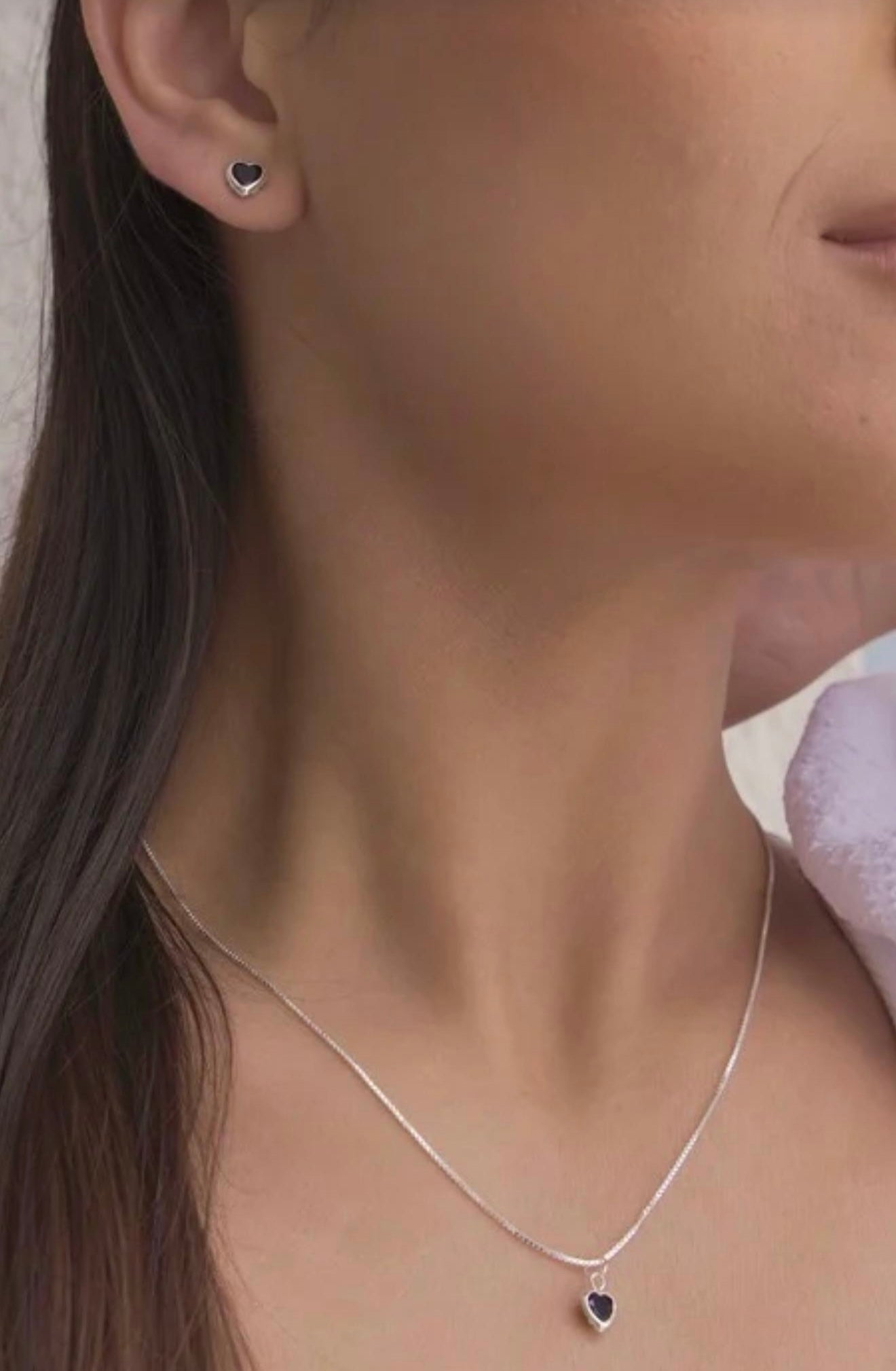 The Silver Heart Necklace & Earrings Set with Black Stone by Solarie is a sophisticated expression of elegance and modern romance. Featuring polished silver hearts adorned with deep black stones, this set captures light beautifully, adding a subtle yet striking shimmer to any ensemble.